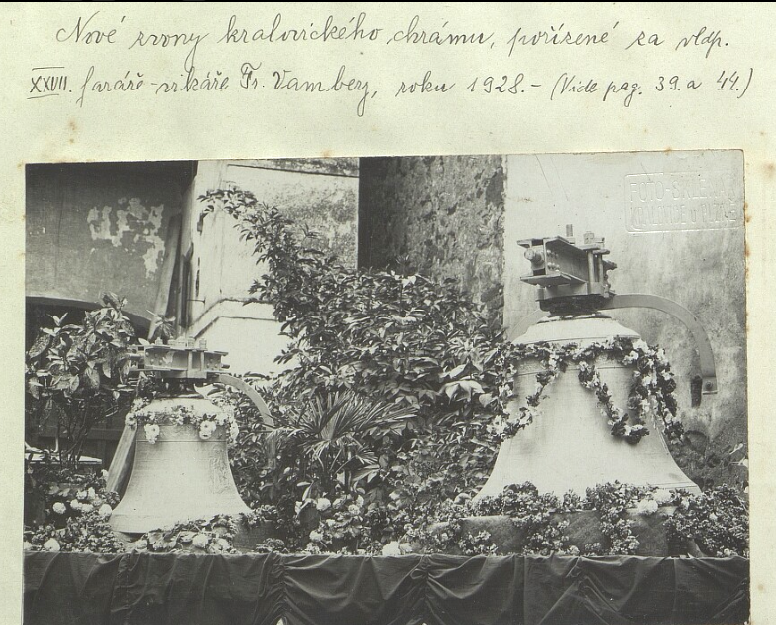 Protože zemřela právě dobrotitelka kostela paní Anna Doležalová poprosil podepsaný farář, aby možno-li se snímáním největšího zvonu poněkud posečkáno bylo, aby ještě hrany a při pohřbu téže vyzváněny byly jako poslední rozloučení s harmonickými zdejšími zvony. Čemuž vyhověno.