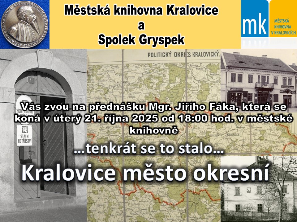 ...tenkrát se to stalo... pokračuje 01.10.2025 07:56 Zveme vás na další přednášku z historie Kralovic do kralovické knihovny, kde bude Mgr. Jiří Fák vyprávět o tom jak to bylo s okresem Kralovice. Udělejte si čas v úterý 21. října od 18:00 hodin.